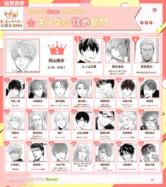 ■「キングオブ攻め部門」「キングオブ受け部門」ではメディアミックスも果たした長寿シリーズ作品のキャラクターが上位に!