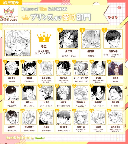 また、「プリンスオブ攻め部門」では、『アフター・ミッドナイト・スキン』(にむまひろ)の犀川雷が、「プリンスオブ受け部門」では『ピンクハートジャム』(しっけ)の金江凉が第2位にランクイン。「プリンスオブ攻め部門」「プリンスオブ受け部門」「ナイトオブサブキャラ部門」の第3位には、「BLアワード2023」コミック部門で1位を獲得した『体感予報』(鯛野ニッケ)の瀬ヶ崎瑞貴、棚田葉、万十(松平可奈美)がそれぞれランクインしており、日常で紡がれるカップルの純愛が人気を博す近年のトレンドを反映する結果となりました。