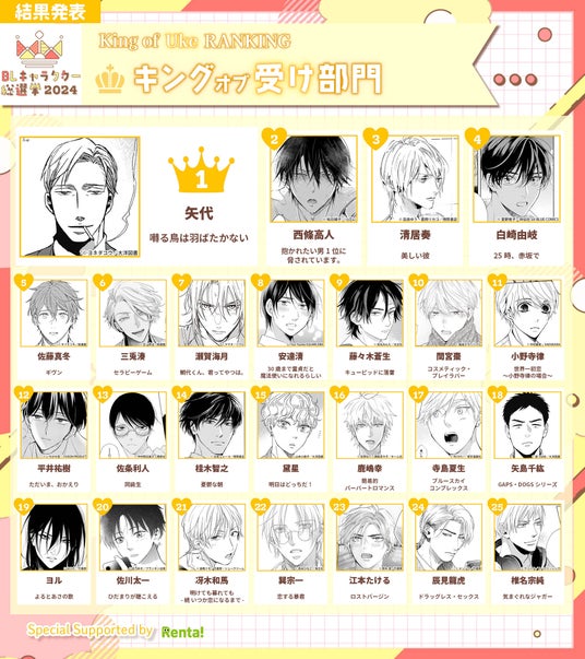 また、同期間に刊行された作品に登場した受けキャラクターが対象の「キングオブ受け部門」では、2013年に1巻が刊行されて以来根強い人気を誇る『囀る鳥は羽ばたかない』(ヨネダコウ)の矢代が第1位に。「キングオブ攻め部門」と同様『抱かれたい男1位に脅されています。』の西條高人が第2位にランクインし、カップリングの人気を伺わせます。