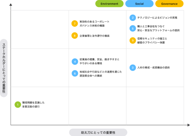 建設業界に従事する全ての人たちを支えるマッチングプラットフォーム「助太刀」を運営する株式会社助太刀(所在地:東京都新宿区、 代表取締役社長 兼CEO:我妻陽一 以下 「当社」)は、ESG・サステナビリティをより重視し、幅広いステークホルダーの皆様からの要請と期待に応えていくために外部専門家(※1)のご意見を取り入れ「マテリアリティ(重要課題)」を特定し、持続可能な社会の実現に向けた取り組みをまとめたサステナビリティサイトを公開いたしました。今後中長期的にESG・サステナビリティを重視した経営の推進を行うことを通じて「建設現場を魅力ある職場に」というミッションの実現を目指します。