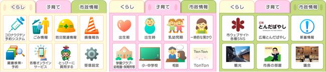 今回のリニューアルでリッチメニューのタブ機能を導入し、デザインも一新しました。くらしや市政情報のタブに加えて、子育て関連のメニューを追加。出産前から教育、相談までさまざまな子育て関連コンテンツをLINEから調べることが可能となりました。