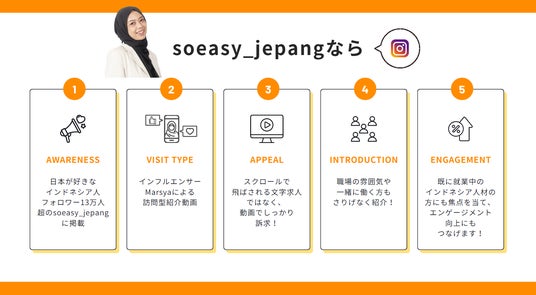 soeasy社が運営する日本に関心を持つインドネシア人13万人以上がフォローするInstagramアカウント「soeasy jepang」で、アカウントを運営する弊社所属インフルエンサーのマルシャが実際に企業を訪問し、職場の雰囲気や仕事内容、スタッフの声をストーリー仕立ての動画で紹介。
