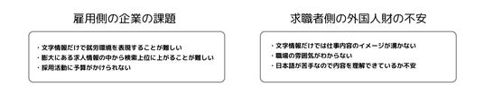 雇用側と求職者側のそれぞれの課題や不安として、企業側は、採用にかかるコスト面や工数面、求職者側としては、テキストによる情報収集に対して、実際の動きが想像しづらいことや、「アットホームな職場です」などという表記に対し実感が湧かず、文化の違いなどから信じにくいという不安感などが挙げられます。