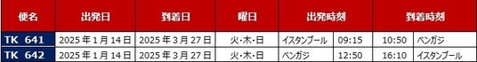 イスタンブール=ベンガジ間のフライトはB737-78D型機で、毎週火曜日、木曜日、日曜日の週3便のスケジュールで運航されます。