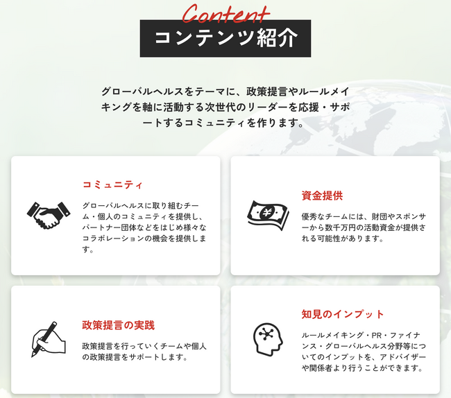 今回のテーマ「グローバルヘルス」は、新型コロナウイルスによって公衆衛生の重要性と不在による脅威が明確に認知された政策領域です。今回はさまざまな団体・個人のご協力をいただきながら、「グローバルヘルス」分野のルールメイカーのコミュニティを形成し、サポートを行います。