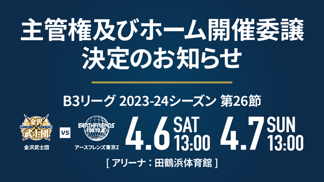 この度、プロバスケットボールチーム「アースフレンズ東京Z」では、B3リーグ 2023-24シーズン 第26節 「アースフレンズ東京Z vs 金沢武士団」戦において、対戦クラブへ主管権及びホーム開催を委譲することが決定しましたのでお知らせいたします。