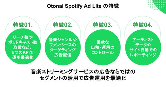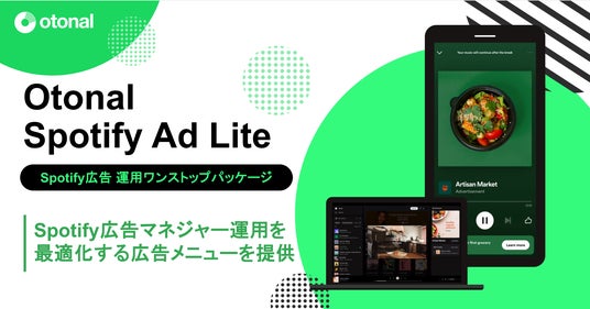 株式会社オトナル(本社:東京都中央区/代表取締役 八木太亮、以下、オトナル)は、Spotify広告の運用ワンストップパッケージ「Otonal Spotify Ad Lite(オトナル スポティファイ アド ライト)」を、広告主と広告代理店向けに提供開始しました。
