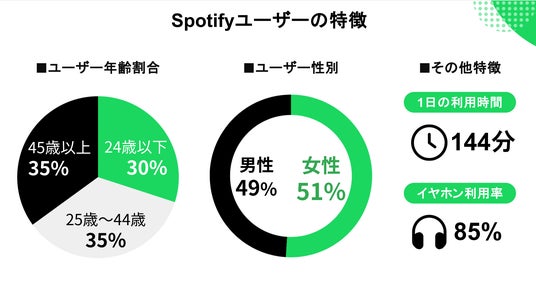 特に若年層を中心に利用されており、44歳未満の利用率は65%にのぼります。1日の平均利用時間は144分と長く、楽曲聴取等による高い没入体験が特徴です。