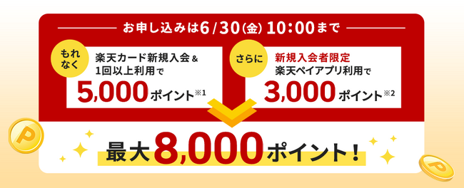 楽天カード株式会社(以下「楽天カード」)と楽天ペイメント株式会社(以下「楽天ペイメント」)は、本日6月9日(金)10時から6月30日(金)10時までの期間内に楽天カードに新規入会し、楽天カードでスマホ決済サービス「楽天ペイ(アプリ決済)」(以下「楽天ペイ」アプリ)でのお支払いをすると、楽天ポイントが3,000ポイントもらえるキャンペーンを共同で開催します。