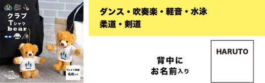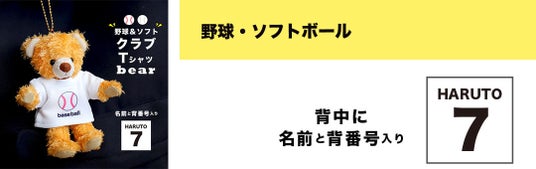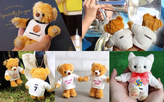 ビブスやTシャツにスポーツロゴと「名前・背番号」を入れて、世界にひとつだけの応援ベアをお作りします。部活やクラブチームで“おそろい”にして団結力を高めるもよし、保護者や顧問の先生からのエールとして贈るもよし。