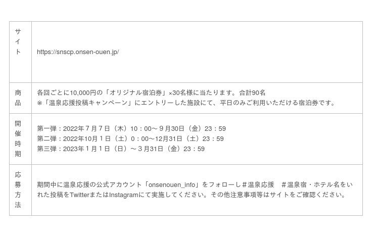 本企画は、TwitterもしくはInstagramで「#温泉応援」など指定のハッシュタグをつけて、国内の温泉宿・ホテルについて投稿をすることで、オリジナル宿泊券が当たるキャンペーンです。投稿は「また行きたい!」「いつもありがとう」「みんなにおすすめ」など、過去に訪れた温泉宿・ホテルへの内容も対象で、今回オープンした「温泉応援」サイトにそれらがまとめて掲載されるため、次回の温泉旅行の行き先や宿泊先を決める際の参考としても、活用することもできます。なお、サイトに掲載する投稿は、事務局にて事前に確認を行うため、広告目的の投稿などが除外された『一般の方の投稿による温泉宿・ホテルの情報サイト』として閲覧することが可能です。