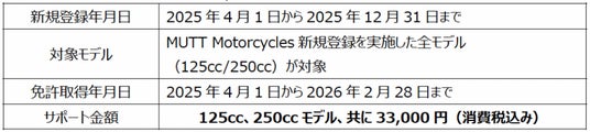 本キャンペーンは2025年4月1日より2025年12月31日までにMUTT Motorcyclesの新車をご契約いただき、新規登録が完了したお客様で、かつ2025年4月1日より2026 年2月28日までの期間に普通自動二輪小型限定免許(MT)、普通自動⼆輪免許(MT)を取得したお客様に対して下記の通り免許取得費用をサポートいたします。