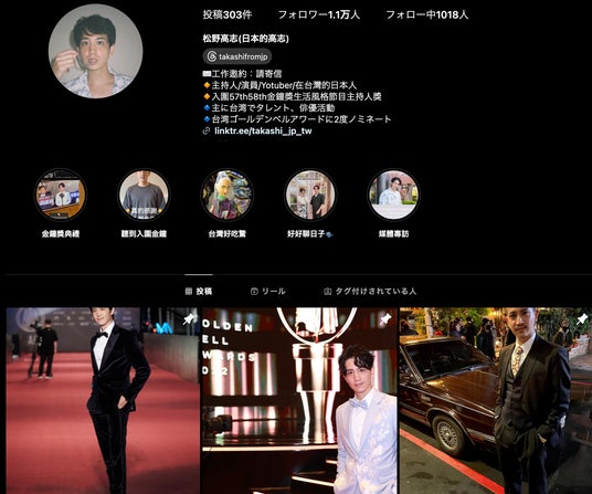 現在YouTubeでは9.98万人、Instagramでは5.6万人のフォロワーを持ち、主に日本の「グルメ」「観光・旅行」「文化」などのジャンルで発信を行っており、これまでに多くのPR実績があります。彼のフォロワーの年齢層は25~45歳と幅広く、彼の動画では現地に住む日本人の視点から、台湾の社会や文化を面白く紹介しています。
