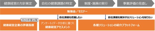 健康経営の成果創出に必要な各種ソリューションの情報を蓄積します。参画企業・団体のソリューション導入経験、効果検証結果をもとにデータベースを構築し、自社の課題に合ったソリューション選定の判断材料を共有します。1社では限定的なトライ&エラーを、多くの企業・団体による集合知で、解決策の実行に関するラーニングスピードを高めていきます。