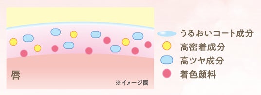 つけた瞬間、スルスルととろけるようなやわらかい質感を実現。うるおいを与え、ワンストロークで美発色・濃密水光艶を叶える、良いところ取りリップ。唇の上でうるおいコート層が、色・艶を抱え込みピタッと密着。色も艶も長持ち!