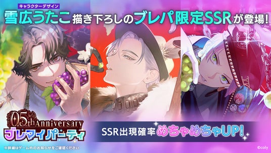 さらにこの三枚のカードが登場する、SSRカードの出現確率がめちゃめちゃUPする0.5周年記念ブレマイパーティが開催中!この機会をお見逃しなく!