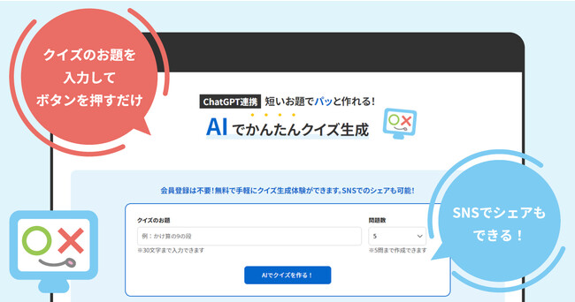 「QuizGenerator」サービスサイトのページ上で、ChatGPT連携のクイズ生成体験ができるようになりました。会員登録の必要がなく、お題を入力するだけで、無料で誰でも手軽にAIによるクイズ生成を体験することができます。