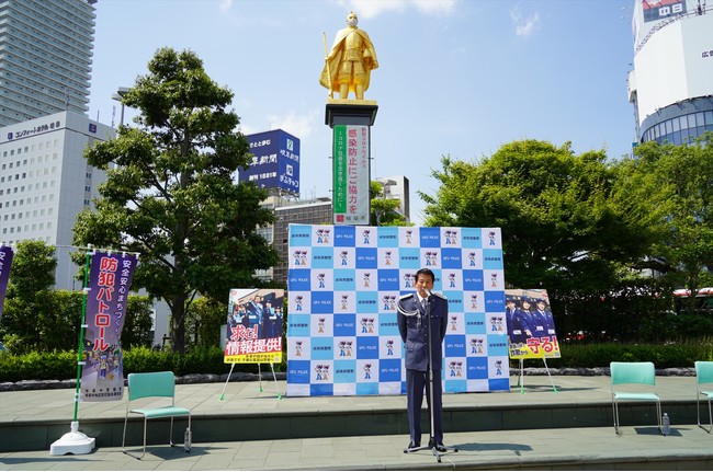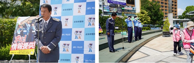 翌日、岐阜県警察本部を訪れた杉対策監は、岐阜駅信長ゆめ広場で行われた『ニセ電話詐欺 被害防止啓発活動』開始式の挨拶のなかで、集まったボランティア団体の方々に対し「社会のため、また警察のために皆さんのお力をお借りできてとても嬉しいです。私も様々な対策を考えていますが、県民の皆さんのお力添えがないと特殊詐欺根絶には至りません。富山県では、防犯団体の協力により、防犯地区の特殊詐欺被害がゼロ件になるなどの事例がありました。それに続けるように一生懸命私たちと頑張っていただきたいです。今後ともよろしくお願いします!」と激励しました。