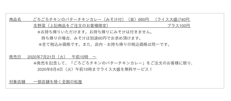 このたび松屋フーズ(本社:東京都武蔵野市、代表取締役社長:瓦葺一利)では、牛めし・カレー・定食・その他丼の「松屋」におきまして、2020年7月21日(火)より「ごろごろチキンのバターチキンカレー」を全国の店舗で発売いたします。