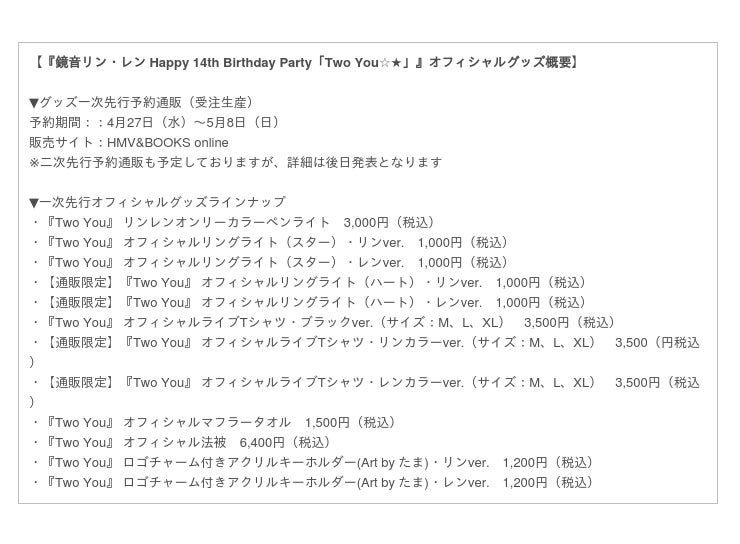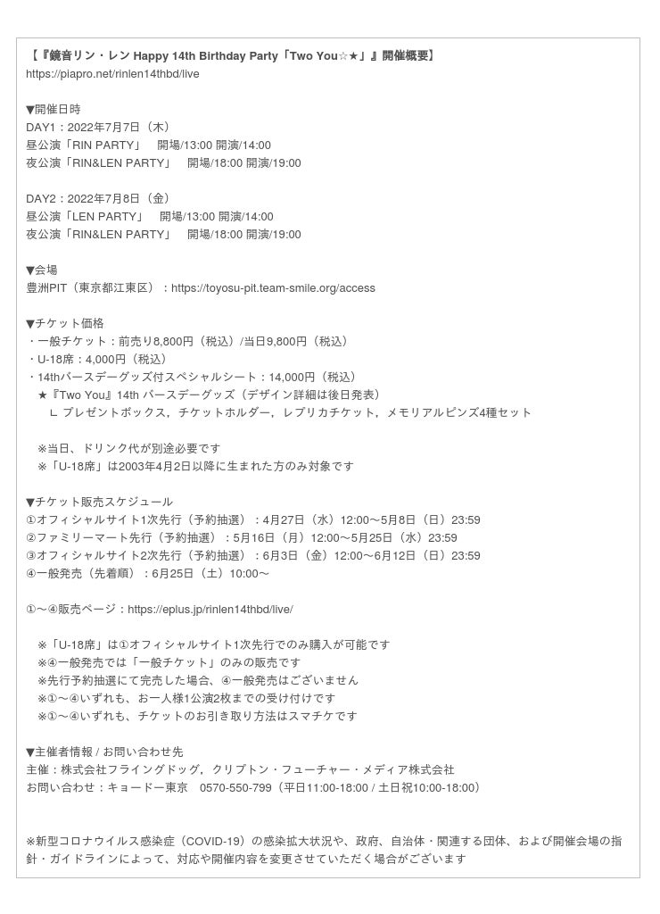 『鏡音リン・レン Happy 14th Birthday Party「Two You☆★」』に関する情報は、下記公式WEBサイト・Twitterアカウントより、随時発信しております。14年間2人を支えてくださった皆様への感謝を込めて展開してまいりますので、『鏡音リン・レン』のメモリアルな14周年を一緒にお祝いしましょう!
