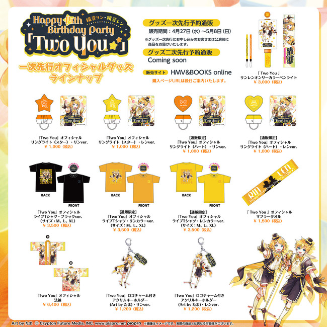 『鏡音リン・レン Happy 14th Birthday Party「Two You☆★」』オフィシャルグッズの販売が決定し、本日ラインナップを公開いたしました。『鏡音リン・レン』テーマカラー(オレンジ・イエロー)限定のペンライトや、ライブTシャツ、マフラータオルなど、2人ならではのデザインが施されたライブ定番グッズをご用意しております。グッズ一次先行予約通販の期間中にご注文いただいた方には、公演前に商品をお届けいたしますので、ぜひ特別なグッズと共にライブをお楽しみください。