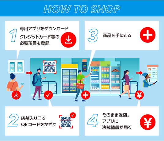 ※2 店舗内に設置されたセンサーやカメラにより購入商品を検知し、レジを通らず退店可能な無人・省人店舗。専用アプリで事前に決済手段を登録の上、QRコード認証により入店することで、入店者を把握し、アカウントに紐付けたクレジットカードで決済される仕組み。