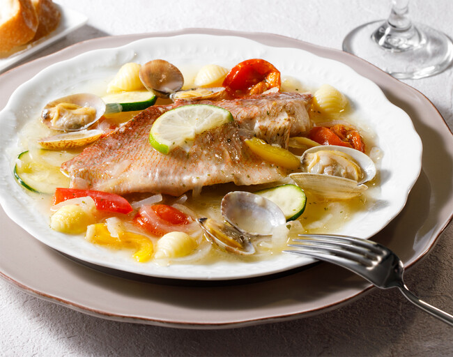 食べ応えのある赤魚とパプリカ、ズッキーニなど彩り鮮やかな野菜の甘みが溶けだした出汁を魚にかけながら、しっとり、ふっくらと仕上げた食べごたえ十分な彩り豊かなアクアパッツァです。