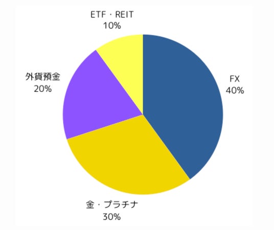 また、投資信託以外でポートフォリオを組んでいる投資家もわずかながら存在した。以下の例のように、FX(40%)・金・プラチナ(30%)・外貨預金(20%)・ETFとREIT(10%)で構成されている。
