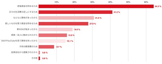 20代が運用を始めた理由としては、老後の資金確保や新NISAの開始が大きな動機となっている。これは、早い段階から将来に向けて資産形成を行っている20代が多いことを示している。