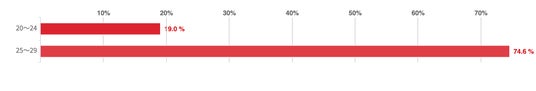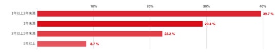 アンケートによれば、「1年以上3年未満」と回答した20代が40.5%で最も多く、次いで「1年未満」と答えたのが30.6%であった。