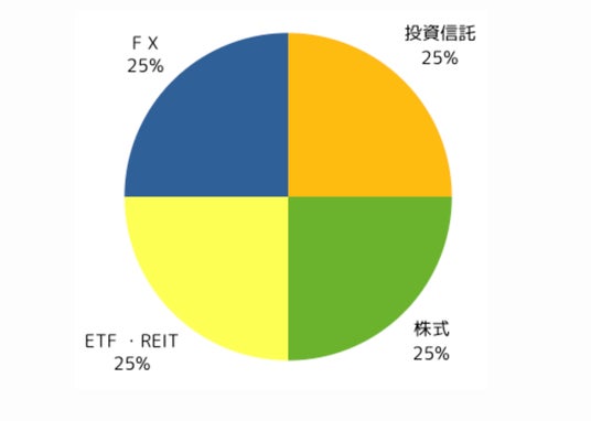 ただ、投資信託と他の資産クラスを組み合わせている場合もあり、以下のように投資信託・株式・ETFとREIT・FXを25%ずつ組み合わせてポートフォリオを構成している回答者もいた。