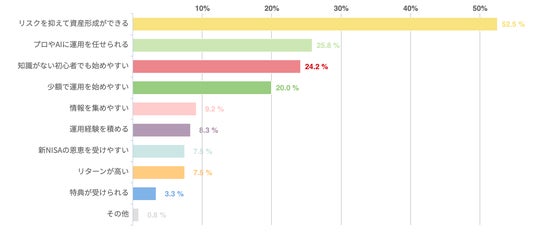 具体的には、「早くから始めて長期運用すればリスクを抑えられる」「配当金の再投資で積立すれば安定してリターンを得やすい」といった意見が多く寄せられた。他にも、「プロやAIに運用を任せられる(25.8%)」「知識のない初心者でも始めやすい(24.2%)」「少額から資産運用を始めやすい(20.0%)」などを取り上げた20代も多かった。