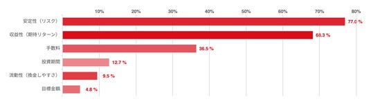 「手数料(37.2%)」や「投資期間(12.4%)」を重視すると回答した20代もいたが、安定性や期待リターンと比較すると優先度は落ちる傾向にある。