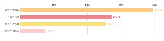 アンケートによれば、「20%~40%台」が39.7%で最も多く、次いで「20%未満(27.3%)」「50%~70%台(25.6%)」「80%以上(7.4%)」という順番になった。