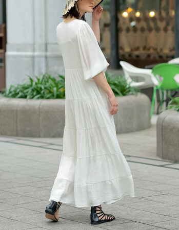 [低身長/高身長サイズ有]Vネックコットンライクバルーンスリーブティアードワンピース
