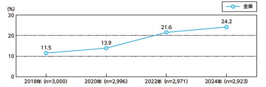 2024年調査のインターネットスポーツ観戦率は全体の24. 2%で、コロナ禍前の2018年11.5%から12.7ポイント、2022年21.6%からは2.6ポイント増加した。