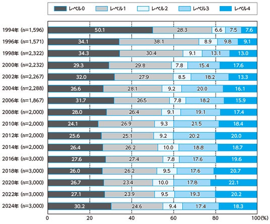 過去1年間にまったく運動・スポーツを実施しなかった「レベル0」は、1994年は50. 1%と全体の半数を占めていたが、2022年は4分の1程度まで減少した。しかし2024年は30. 2%に増え2006年以来の3割超えとなった。