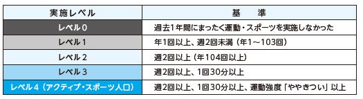 運動・スポーツ実施レベルは、「実施頻度」「実施時間」「運動強度」をもとに、運動・スポーツ実施状況を量的・質的観点から捉えるSSF独自の指標である。