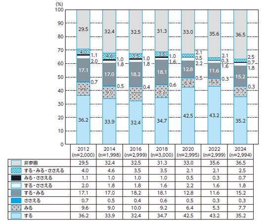 過去1年間にスタジアムや体育館等で直接スポーツを観戦した者の割合の年次推移を示した。2024年は26. 2%であり、コロナ禍前の水準には戻り切っていないが、2022年19. 3%から6. 9ポイント増加した。