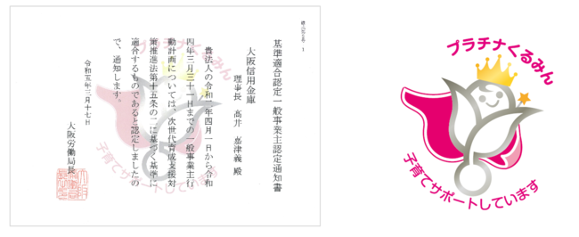 大阪信用金庫は、2020年に「くるみん」認定を受けておりましたが、その後もより高水準な取組みを実施していることが認められ、2023年3月17日、「プラチナくるみん」認定を受けました。