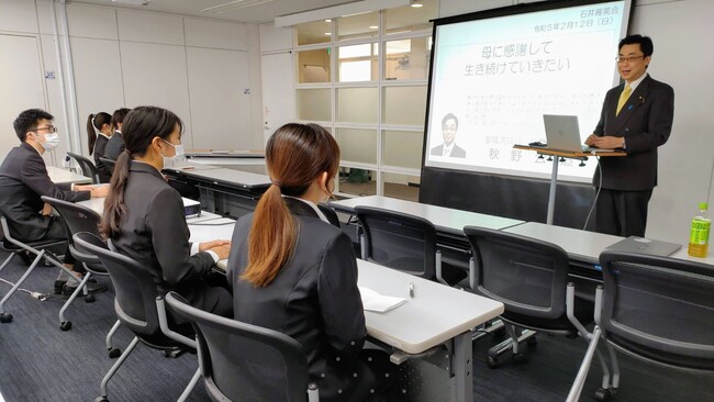 自身も高校から大学、大学院まで授業料免除や奨学金で学業を達成され、48歳で奨学金返済を終えられた経験を基に、家族や学生を支援する団体への感謝の気持ちを奨学生に伝えられました。参議院議員であり、医師であり、客員教授という多彩な専門性の観点から、自身が提出した議員立法「生殖補助医療法」の成立を通じて、民法の視点から親子関係や摘出、選択的夫婦別姓の話題など国会における法改正を含む制度改正などを話されました。