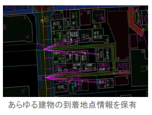 ゼンリンでは、表札情報やテナント、住所情報等を1軒1軒調査し記録した「住宅地図データ」や、細道路を含む全国の道路を整備した「道路ネットワークデータ」の他に、幅・高さ・重量・時間帯による交通規制等の「大型車規制情報」や、ドアtoドアのルート探索を実現する「建物到着地点情報」等を整備しています。ゼンリンが保有する様々な地図データを高度な自動配車エンジンと組み合わせることで、お客様の配車計画やラストワンマイルにおける配送精度の向上を支援します。