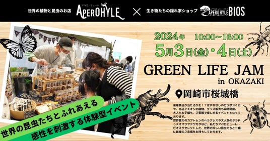 一般社団法人日本福祉協議機構(本社:愛知県名古屋市天白区井の森町)が運営する、世界の植物と昆虫のお店【アペロ・ヒューレ】(https://aperohyle.com/)と生き物たちの隠れ家ショップ【アペロヒューレ・ビオス】は2024年5月3日(金)、4日(土)の2日間、岡崎市で開催されるGREEN LIFE JAM in OKAZAKIに出店いたします。
