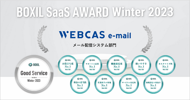 自社開発システム「WEBCAS(ウェブキャス)」と「WOW engage(ワオエンゲージ)」を通して、企業のマーケティングとカスタマーサクセスにおけるコミュニケーションの課題解決を支援する株式会社WOW WORLD(ワオワールド/本社:東京都品川区、代表取締役社長:美濃 和男、以下、当社)は、スマートキャンプ株式会社(以下「スマートキャンプ」)が優れたSaaS※を表彰する「BOXIL SaaS AWARD Winter 2023」のメール配信システム部門において、当社の提供するメール配信システム「WEBCAS e-mail(ウェブキャス イーメール)」が「Good Service」ならびに、口コミ評価9項目全てにおいてNo.1として選出されたことをお知らせいたします。