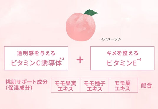 ビタミンC誘導体*³やビタミンE*⁴を配合することで、みずみずしく澄んだ“桃肌”へと導きます。さらに、桃肌サポート成分(保湿成分)として、モモ果実エキス、モモ種子エキス、モモ葉エキスを配合。肌にうるおいを与え、しっとりとしたもちもち感をサポートします。