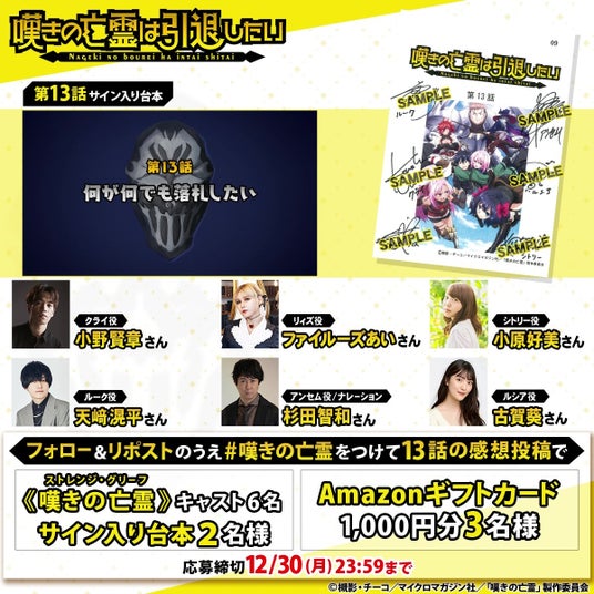 第13話の放送を記念して、《嘆きの亡霊》メンバー6人(小野賢章さん(クライ役)、ファイルーズあいさん(リィズ役)、小原好美さん(シトリー役)、天崎滉平さん(ルーク役)、杉田智和さん(アンセム役/ナレーション)、古賀葵さん(ルシア役))の直筆サイン入り台本やAmazonギフトカード1000円分が当たるキャンペーンを開催いたします。