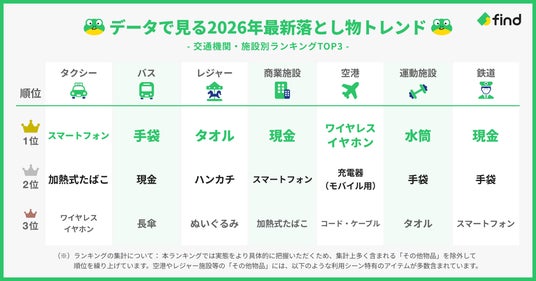 「落とし物が必ず見つかる世界」を目指し、「落とし物クラウドfind」を展開する株式会社find(所在地:東京都港区、代表取締役CEO:高島 彬)は、4月25日の「拾得物の日」を前に、全国4,000施設のデータを分析した施設別の落とし物ランキングを公開いたします。