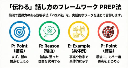 株式会社リスキルは、ビジネスにおける説明力を高めるための「PREP法徹底実践研修」をリリースしました。本研修は、結論から伝えるフレームワークであるPREP法を、ワークを通じて身に付ける内容です。受講者は、報告や提案などの多様な場面において、論理的で説得力のある話し方を実装します。聞き手の負担を減らし、要点を正確に伝えるための具体的な手法を提示します。
