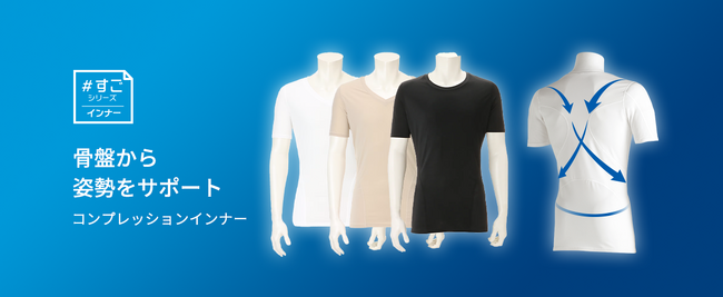 一般的なコンプレッションインナーは、適度に筋肉に着圧をかけることで、身体の動きをサポートし、パフォーマンスの向上が期待できるインナーとして、スポーツのシーンで多く使用されています。当社の商品では、背中に着圧をかける機能に加えて、骨盤を安定させ自然と背筋が伸びるように設計し、正しい姿勢の維持をサポートする特許技術を採用しています。正しい姿勢を保つことは、首や肩、腰の負担を軽減するなど健康面にも大きな影響を与えるとともに、長時間の作業も疲れにくくなり、作業効率も上がるなどの効果が期待できます。そのためこのインナーにより、姿勢を整えスーツ姿をより美しく、さらに仕事のパフォーマンス向上も期待できるとして、2023年2月の発売開始以来、多くのビジネスパーソンにご好評いただいております。