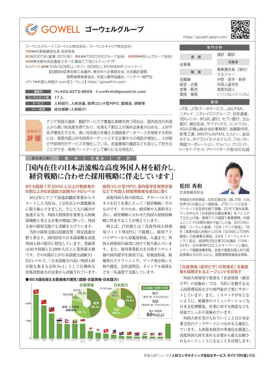 ゴーウェルグループは、アジア言語の通訳・翻訳サービスで豊富な実績を持つ同社は、国内在住の外国人から高い知名度を得ており、社員も7割以上が海外出身者が占める。人材不足が慢性化する中、高い日本語力を備える登録者データベースを保有する同社には、高度外国人材を採用ターゲットとする企業からの相談が増加し、人材紹介や採用代行サービスを強化している。在留資格の確認なども安心して任せることができ、採用パートナーとして頼りになる存在だ。